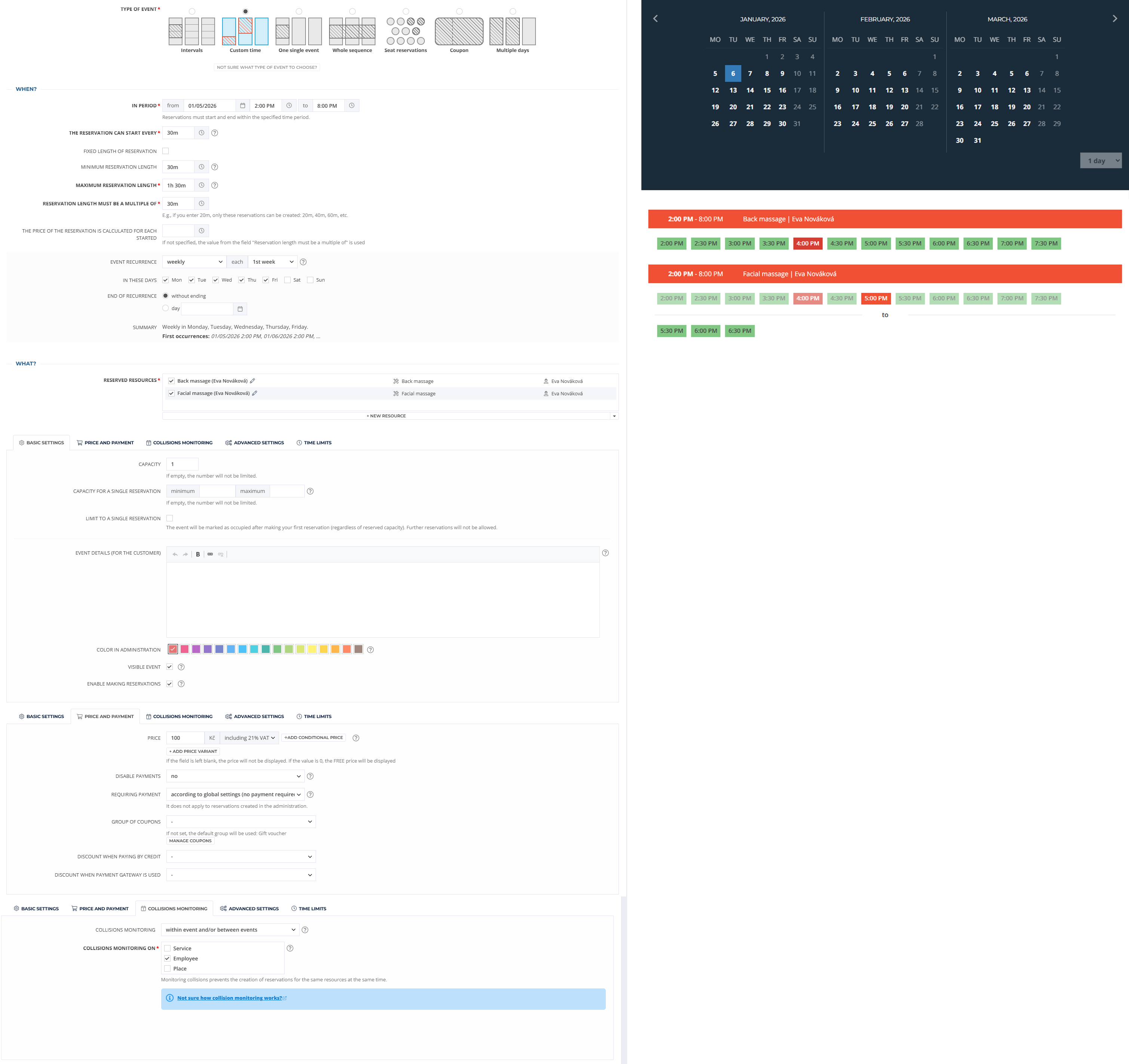 As an entrepreneur, you can provide multiple services that vary in length or price. For this type of business, it may also be appropriate to offer dates with any booking time. An example is a businessman engaged in massage services of two kinds, back massage and facial massage. In this case, collision monitoring should be set up for the employee, as at the time one masseur cannot perform both services at the same time. The sample face massage is for 30 minutes and the maximum length is one hour. Massages can start every half hour. The second service - back massage - must be set up in the same way.