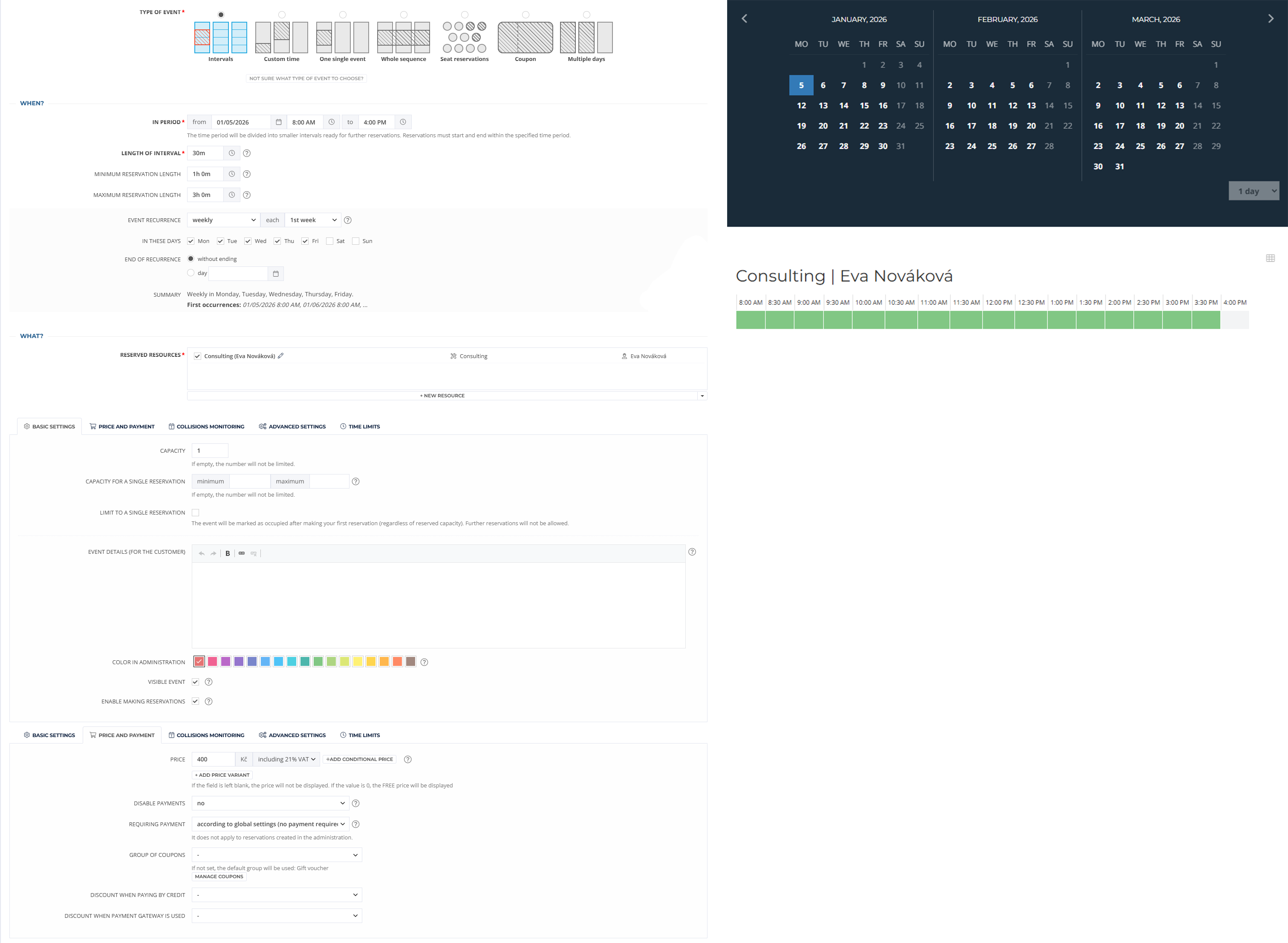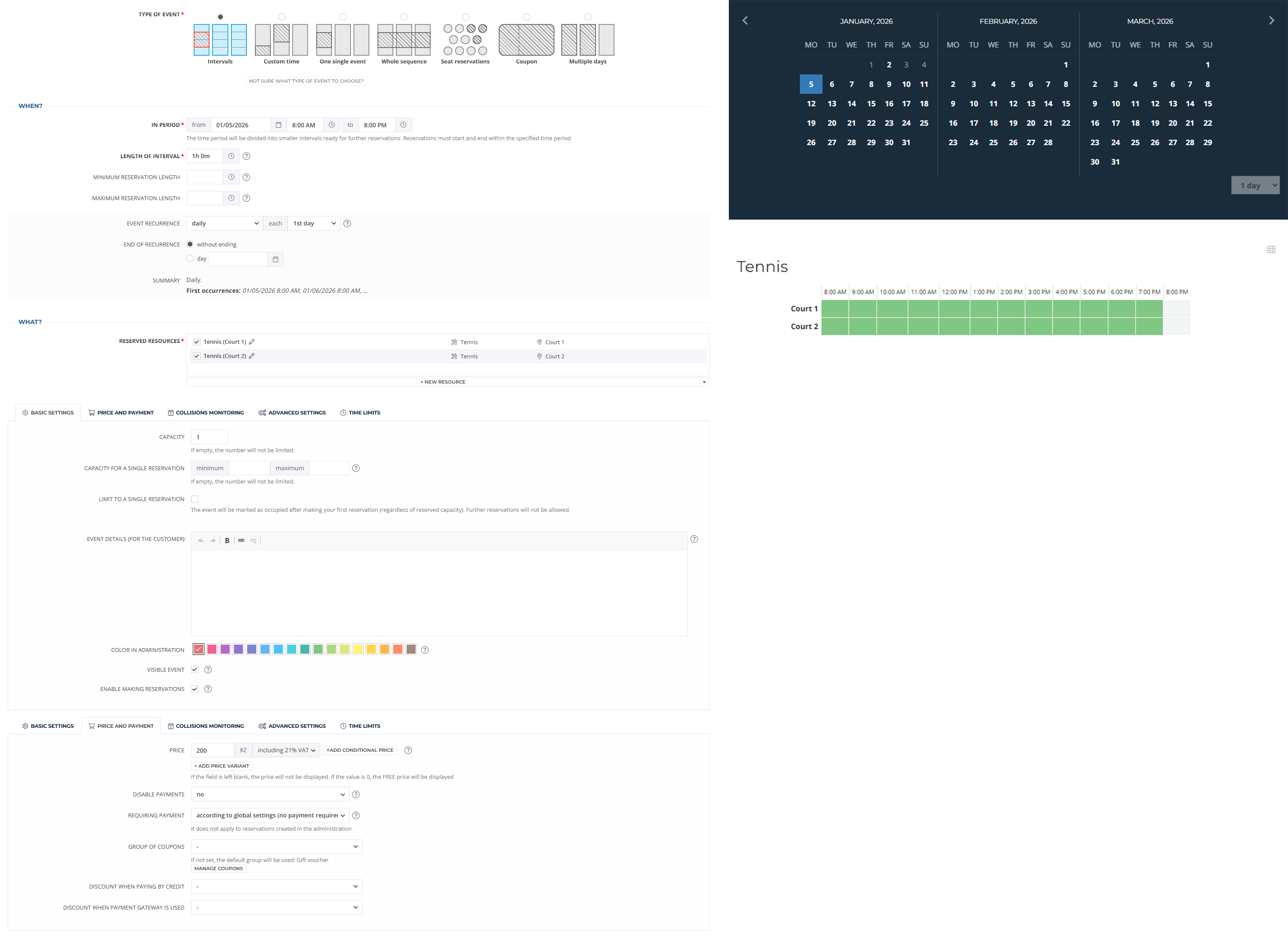 A typical example is a sports complex that offers various sports grounds for rent. In the demonstration, the user allows booking on tennis courts. The size of the interval is set to one hour as usual. There are two courts at our disposal, which we want to rent after one hour at a fixed price.