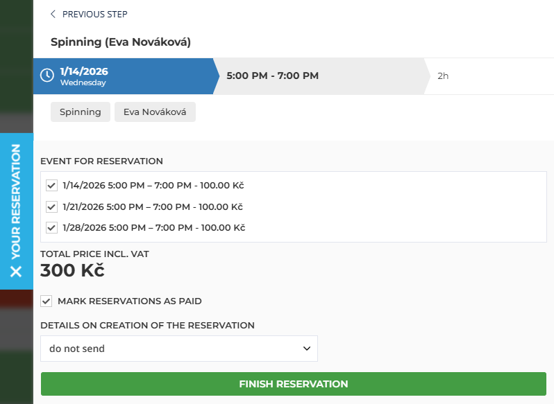 After confirming the period, the system searches for available dates and displays a list of all reserved dates. Bulk reservations can also be marked as paid, in which case the customer will not be able to cancel them himself. If the list is long, it is also advisable to consider whether or not a notification should be sent for each reservation created, in order to avoid possible congestion of the customer's e-mail box.