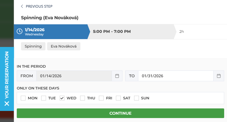 Reservation of multiple reps requires a period. All dates that have been created will be reserved within the specified time period. Therefore, if the appointment is set to repeat for several selected days of the week, but the customer wishes to book appointments regularly only on one selected day, it is also possible to select specific days that will be reserved in the given period.