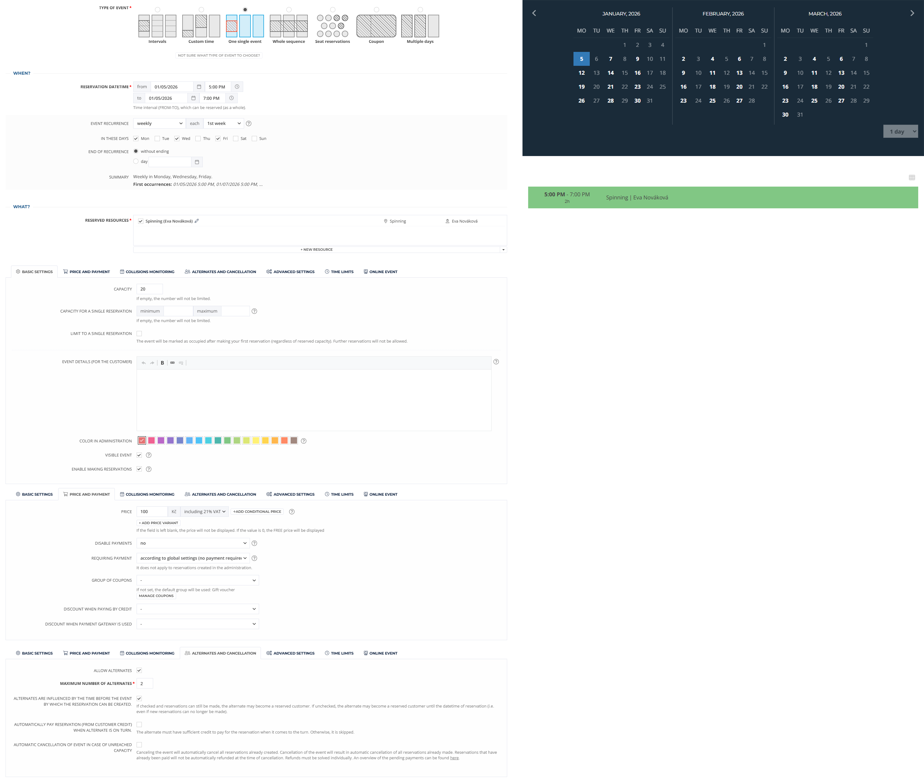 In the case of this type of event, the customer, as the name suggests, always reserves the entire specified term, ie a fixed period of time (from - to). Typically, this is an event that has a larger capacity set and it is possible to book more customers within the same time period.