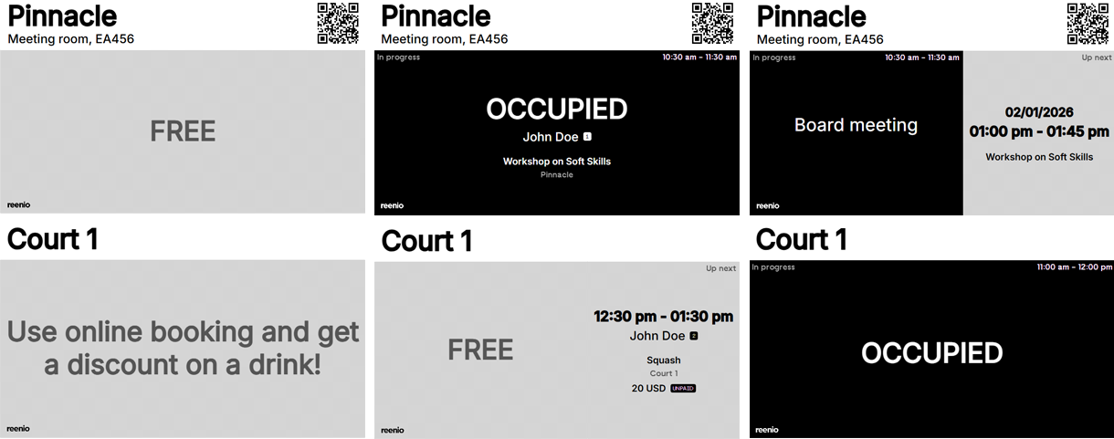 TRMNL is a combination of simple hardware and a flexible software platform that can serve very well and efficiently for displaying important information in public or work spaces. For the easiest possible use of this platform together with the reenio reservation system, a plugin is available that ensures direct connection of the display to specific reservation data without the need for programming or complex setup. The image below shows examples of various display options and situations for presenting reservation information using this plugin.